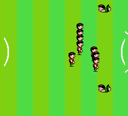 Mais c'est incroyable ça madame ! Enfin un jeu qui propose des équipes complètes. Bon certes les maillots n'y sont pas, mais les 10 malheureux pixels qui cohabitent (pour reprendre le cri d'amour du crapaud) pour créer un joueur sont véritablement mignons. Oui, c'est vraiment un jeu de jap' pour les jap'. Tam, tu devrais aimer. Attention, on est tout de même loin d'un Nintendo World Cup hein ! Mais l'effort a été fait, et l'ensemble visuel est agréable.