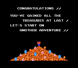 Malheureusement, comme la version NES de ce jeu est est le plus mauvais portage, les développeurs ont été un peu plus loin dans la souffrance, et une fois assis sur votre tas d'or, vous voilà de retour dans la grotte, la même, le même plan, les mêmes ennemis, et une palette graphique encore plus laide. Et surtout, les clefs sont devenues invisibles. Elles sont par chance au même endroit que la fois d'avant, mais comme vous étiez trop occupé à survivre qu'à noter leurs emplacements, vous voilà bien embêté.