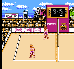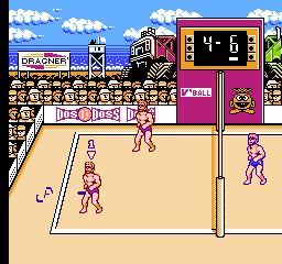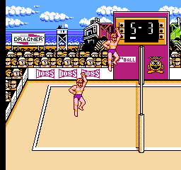 Bon du coup ça se regarde, ça s'écoute, ça se paramètre, mais est-ce que ça se joue ce merdier ? Bah oui mon gars, et pas trop mal en plus. Alors on va pas se la raconter, passé le 4ème tour du tournoi de base, vous allez en chier comme un ouvrier polonais sous Jaruzelski tentant de nourrir sa famille. Chaque point se gagnera dans une marée de sueur mêlée de sang, mais la victoire n'en sera que plus belle. Enfin j'imagine, moi j'ai pas réussi. La faute à des attaques supersoniques pratiquées par l'adversaire et que j'ai été incapable de bloquer ou même de reproduire à mon compte. Il est intéressant de constater que ces super attaques ressemblent étrangement à celles qui feront la réputation et la gloire de Nintendo World Cup, ce qui positionne Super Spike V'Ball comme un cousin indubitable de la famille Kunio-Kun. Le très incongru “KA-BOOOOM” accompagnant lesdites attaques entérine d'ailleurs définitivement ce lien de parenté.