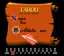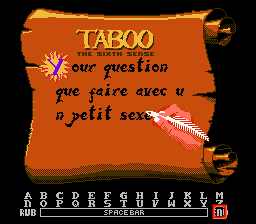 Il fait nuit, mes yeux pèsent trois tonnes. Un bourdonnement épouvantable bat dans mes tempes. Il faut que je joue. Je prends la première cartouche qui me passe sous la main dans un râle. Taboo – The sixth sense. Parfait, jamais vu, la pochette est jolie, je suis sûr que si le bon docteur avait encore des yeux il aurait apprécié. Je prends quelques pilules. Le doux docteur m'en donne toujours une par une, j'en ai marre, gros gavage j'en prends plein.