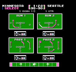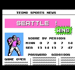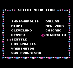 Un joueur, deux joueurs, ou encore un énigmatique et insignifiant mode coach (et autant être clair immédiatement : je n'écrirai rien sur cette merde), tels sont les choix de jeu proposés sous un logo débordant de stars and stripes, des fois que l'on aurait oublié. Puis l'écran de sélection de son équipe : il y en a plein, toutes de valeurs inégales, mais peu importe le flacon tant qu'on a l'ivresse, donc je prends Minnesota, comme ça, pouf. Et si jamais on veut reprendre sa partie précédente, on n'oublie pas de saisir son mot de passe. Car oui, le jeu va être long si on veut aller jusqu'au bout, car il faudra défaire tour à tour toutes les équipes présentes, soit onze matchs à gagner. Après chaque rencontre un mot de passe, et croyez-moi ce sera utile. Ca ou une sauvegarde automatique, mais diable, notre NES d'origine ne le propose pas.