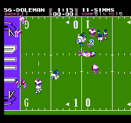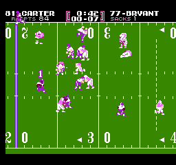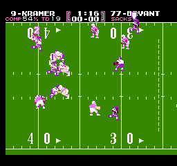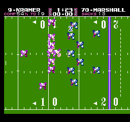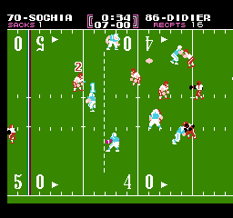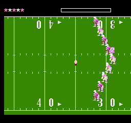 Une fois le choix effectué, nous voilà jetés dans le grand bain, sans cérémonie en grande pompe. Un terrain vert s'affiche, l'action se déroule de gauche à droite avec défilement de l'écran jusqu'aux zones d'en-but opposées sur fond de musique guillerette. La NES crache tout ce qu'elle a pour afficher les deux équipes. Je plaisante, il suffit de voir les captures d'écran pour voir que neuf bonhommes de couleur baveuse en affrontent neuf autres dans une couleur différente du même tonneau. Mais si nous sommes en 1989, l'année de sortie de