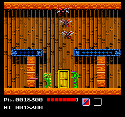 Mais non jeune sot, je plaisante. Il s'agit de castagne pure et dure, vous allez donc avoiner du décérébré - non hispanique, comme quoi - par camions de 50. En apparence c'est simple et y'a bon : des plateformes, des ennemis, on saute, on fritouille. En appuyant sur start on peut changer de tortue, ce qui a deux implications. D'une, chacune de vos tortues a une barre de vie indépendante des autres (et UNE seule), ce qui fait que quand par exemple Raphaël commence à fatiguer du pinceau, vite vite, on appelle Donatello à la place jusqu'à retrouver une recharge de santé (je vous le donne en mille : une pizza). De deux, chacune a des caractéristiques bien précises, notamment au niveau de la portée, de la vitesse et de la puissance de son arme ; caractéristiques qui seront utiles en fonction des passages.