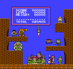 Houlà la vache. Ca éblouit. Voyons je... mais... que ??? HEY ! C'est quoi cette blague ? C'est un bizutage ou quoi ? Qui est le con responsable des costumes ici, je peux pas rester avec ces couleurs quand même ??? Ah merde je tombe... ah ben c'est pas de la grosse gravité là, on peine à atteindre le 0,5 km/ sec²... non mais c'est quoi ce traquenard, tout est hideux par ici, je savais que la NES avait une petite réputation de faire dégueuler les pixels mais bon là y'a de l'abus... heulà, ça y est on me fait bouger, ah je vois où il veut me faire tomber, ok, attention ça va accélérer... dès que je serai... à .. la.. verticale... de.. ce...