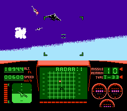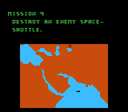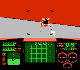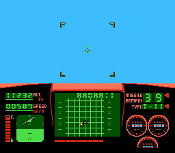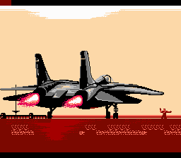 Le jeu est divisé en missions. Une par niveau, cela va de soit. On a un petit écran de briefing, que j'ai mis des années à comprendre. Etant jeune, ce n'était qu'une tâche ignoble avec du marron. J'ai compris 10 ans plus tard que c'était l'Arabie et la mer. Et c'est le décollage. Le but en soit a peu d'importance. En gros : tout casser. On décolle. Et la frayeur. A quoi peut ressembler un jeu d'avion sur NES ?