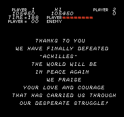 Si ce jeu n'est pas exempt de tout défaut (dont le principal reste la durée de vie inversement proportionnelle au plaisir que ce jeu procure), il demeure pour moi essentiel à toute bonne ludothèque telle une véritable bible de l'action condensée Made in CAPCOM, résolument accessible et possédant une âme que seul les véritables classiques possèdent. Mon objectivité est surement tronquée du fait que TROJAN a constitué mon dépucelage sur NES mais nom de Zeus comme c'était bon… Se souvenir des montées d'adrénaline quand ces ennemis collants se trouvaient sur mes talons (d'ACHILLE… terminons par une vanne foireuse) est un plaisir inégalable et si je vous ai donné envie de le découvrir (ou de le redécouvrir), ce sera bénéfique pour mon Karma d'Oldies et un réel honneur pour votre humble serviteur…