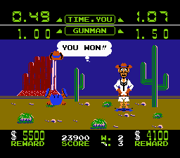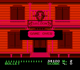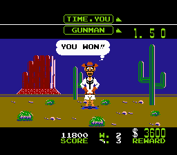 Et dire que j'ai eu ce jeu en cadeau à un anniversaire quand j'étais gosse. Initialement, j'avais reçu Faxanadu, mais j'avais demandé un échange puisque je l'avais déjà terminé. Que ça peut être con un gosse quand même. Divertissant quelques minutes, Wild Gunman sombre rapidement du mauvais côté de la barrière en faisant moins bien que son cousin Duck Hunt, fallait le faire.