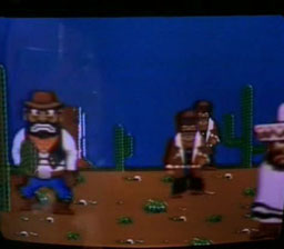 Deuxième mode, deux bandits. Le même que le précédent, mais avec deux adversaires simultanés sur l'écran (un à gauche, l'autre à droite). L'écran est cette fois-ci partagé en deux zones de tir. Même difficulté qu'auparavant, sauf qu'il faudra cette fois bien choisir l'ordre dans lequel descendre les coyotes à foie jaune. Hum.