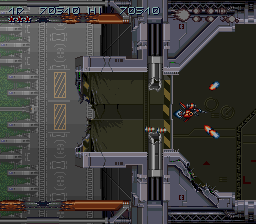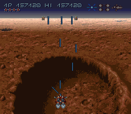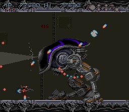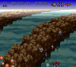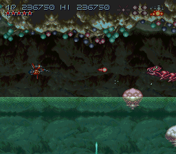 Et si je parle de style de vue, c'est parce qu'il y en a deux : la vue horizontale, où le vaisseau est vu de coté, et la vue de dos ! Car tenez vous bien, Axelay intègre le mode 7 de nintendo, ce qui lui permet de faire une vue de type 3D (style Mario Kart). Mode 7 qui est amélioré, car les graphismes donnent l'effet de voler en profondeur sur une sphère (on a l'impression de survoler la Terre à haute altitude). C'est incroyablement beau. Et l'alternance des stages horizontaux et mode 7 est une idée de Konami qui permet au joueur de ne jamais se lasser. Le jeu commence d'ailleur en mode 7 pour mettre KO le bizu qui s'y prête. Et si la vue de dos est une véritable bombe graphique, le mode horizontal vu de coté est minutieusement détaillé (le monde semi-aquatique est trop beau). Rien que pour ça, le jeu se situe au premier rang du shoot'em up sur 16 bits. Et même si les gens qualifiaient la musique d'inaudible, cela n'enlèverait rien au mérite du jeu. Mais le pire…
