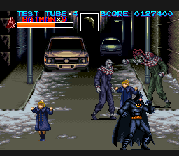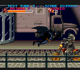 Pour ne pas ennuyer le joueur, le jeu alterne des scènes où l'on peut progresser dans toutes les directions, avec des scènes à scrolling horizontal, et bien sûr (sinon ce serait une insulte) un stage spécialement consacré à la Batmobile, intégrant le fameux mode 7, avec des bosses sur la route donnant l'impressions de faire les montagnes russes, et des motards à dégommer, des bonus, ainsi qu'un boss qui conduit un camion pour clôturer le stage. Vraiment sympa.