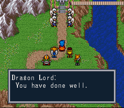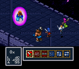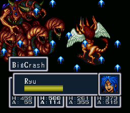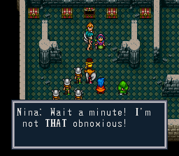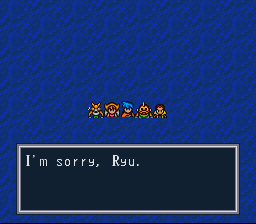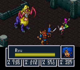 Comme si ça ne suffisait pas, la gestion des menus est désastreuse. C'est lent, fouilli, et il y a 15000 étapes de confirmation. Changer son armure est un calvaire. Ranger son inventaire aussi. Eh oui, pauvre fou naïf, si c'est déjà la foire dans le 2, c'est sûrement pire dans le 1 ! Eli, eli, lemma sabachtani ! Donc, non seulement on se fait chier en se baladant, mais aussi en gérant son équipe ; et il y a des choses à faire dans les menus, hein. Que ça soit en vous baladant ou combattant, on a toujours des magies à lancer, des objets à gérer, des transformations en dragon à faire, l'ordre des personnages à changer, deci-delà et tutti quanti. (Avec ce truc complètement pissant quand on lance une magie avec Ryu, à savoir qu'il lève le doigt façon disco vers le ciel, genre "hé moi Madame je sais la réponse hep je sais je sais il faut lancer un sort de dragon moi Madame !". Culte.)