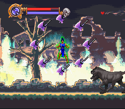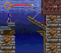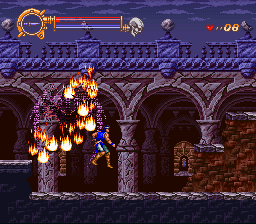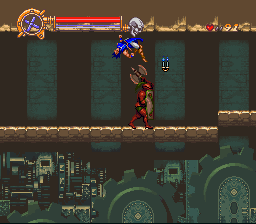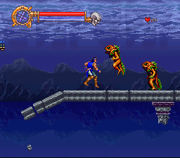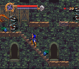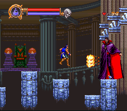 Oui j'ai dit plus haut qu'elle était bonne. Elle serait très bonne pour Castlevania 1 sur NES, ou pour tout autre jeu qui ne serait pas SORTI APRÈS LE IV !!!!!! Parce que dans le IV, souvenez-vous, Simon Belmont avait miraculeusement guéri de sa paraplégie ; il sautait, avançait accroupi, et il AVAIT UN FOUET QU'IL POUVAIT FAIRE TOURNER DANS TOUS LES SENS et rien que ça justifiait l'achat du jeu. Le meilleur point de gameplay du IV, eh ben figurez-vous qu'ils l'ont enlevé, on retourne à un jeu à l'ancienne, je frappe devant et puis c'est tout. SCANDALE ! Et vu que visiblement le pad de la Super Nintendo n'a pas assez de boutons, il faut appuyer sur attaque + haut pour lancer la célèbre arme secondaire. On croît rêver !