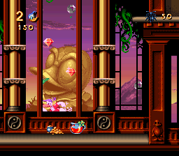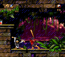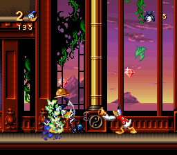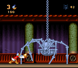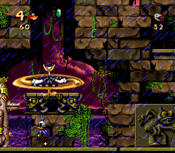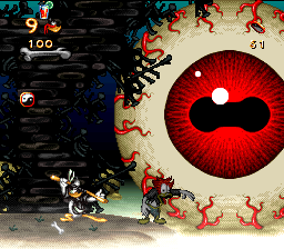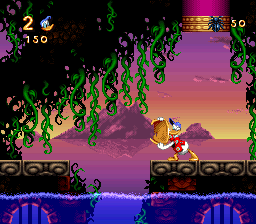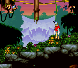 Ici chez Donald Duck in Maui Mallard, même confiote : Les affrontement au bâton sont catastrophiques, mais le pire des supplices sera la série d'épreuves de saut à l'élastique. Par trois reprises, l'épreuve consistera en un saut attaché à une liane (et donc à l'esquive de nombreux murs de ronces à la hitbox douteuse) auquel s'ajouteront divers défis incompatibles avec la difficulté imposé par les collisions aussi nombreuses qu'improbables subies au cours d'un saut. Non vraiment, l'exemple typique d'un niveau plein de bonnes idées, tout joli, mais très mal conçu lorsqu'on gratte la couche de vernis.