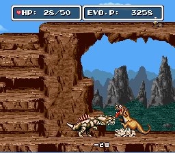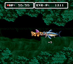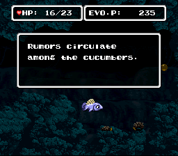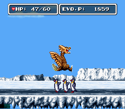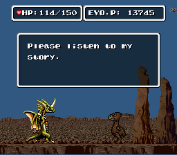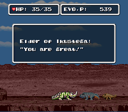 Alors là, vous me voyez confus. Le jeu est comme je le disais auparavant de l'ordre du divertissement, il est même parfois parodique. Les situations sont souvent cocasses et aidées par une réalisation aux petits oignons : les différentes époques sont toutes bien distinctes, avec des environnements qui leur sont propres, c'est bien fichu. Les sprites et animations de tous les protagonistes du jeu sont bien variés, c'est un régal de les voir interagir, leurs mimiques lorsqu'ils sont blessés sont souvent poilantes ! L'humour est omniprésent, voir par exemple que les rogons, une forme évoluée de requins chevauchant leurs congénères et armés de pistolets laser, cherche à conquérir le monde au début de notre période est révélateur de la folie ambiante que EVO dégage. D'ailleurs, il sera parfois possible d'accéder à des fins alternatives en fonction de choix que l'on aura accomplis. Gaia commente ce que devient le monde si l'on accepte de suivre telle ou telle espèce dominatrice. « Oui, et tout cela à dessein des Pokémons, bien entendu. »