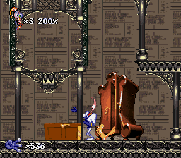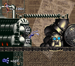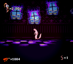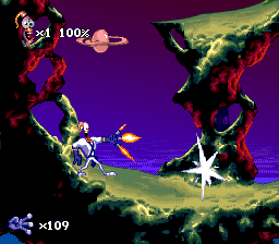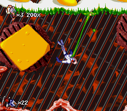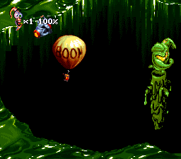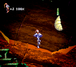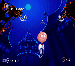 Cependant la réussite esthétique ne fait pas tout (Même le plus beau des aquariums lasse au bout de trois quatre heures de visionnage. Si si : essayez). Pour prendre conscience de l'ampleur de la puissance de ce jeu, il faut aussi se tourner vers le gameplay et le level design. Et de ce côté, on a affaire à du lourd, du très lourd, aussi lourd que le cousin Justin quand il essaye vainement de se taper la cousine Marguerite au mariage de l'oncle Albert : on s'est pas foutu de votre gueule. Jim n'a pas glandouillé entre les deux opus : il s'est entrainé dur, le bougre. S'entrainer signifie devenir plus fort, plus rapide mais aussi acquérir de nouvelles aptitudes. Ses nouvelles capacités, Jim les doit à un machin vert gluant non identifié qu'il s'est fait greffer dans le dos. Ce flubber a deux utilités : premièrement, il remplace la tête hélice qui permettait à Jim de planer après un saut par un parachute certes moins amusant mais plus facile à enclencher. Ensuite, et c'est le point le plus important, il peut servir de grappin. En appuyant sur le bouton A lors d'un saut, flubber se déploie et peut s'accrocher à des taches de slime au plafond pour s'y balancer comme au bout d'une corde. Je sais, dis comme ça cela fait un peu je me sers de mes crotte de nez comme d'une liane alors que ce n'est pas du tout comme ça dans le jeu. En fait si ça donne exactement cette impression mais je m'en voudrais de vous dégouter d'un si bon jeu avant même que vous n'y ayez touché alors on va faire comme si.