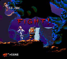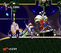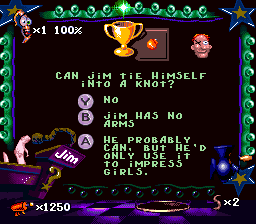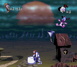 Rire, c'est bien le mot. Car oui, Earthworm Jim 2 est poilant ; on se fend la margoulette du début jusqu'à la fin. Ce jeu est une ode à l'humour, bien plus que le premier d'ailleurs (oui parce que le 2 à la fin du titre ce n'est pas un effet de style, ça veut dire que c'est la suite du numéro 1, que vous a-t-on appris à l'école ?). Earthworm Jim 2 ne se contente pas d'être une simple suite du premier opus des aventures du lombric bionique : il corrige ses défauts les plus flagrants pour en faire une bombe vidéoludique. Ainsi, la première différence notable entre les deux jeux est l'ambiance qui y règne. En effet, même si l'humour était très présent dans Earthworm Jim premier du nom, ce dernier conservait une atmosphère sombre et plutôt axée adulte. Dans le second épisode, on a affaire à un univers beaucoup moins mature, plus cartoon. Les personnages sont beaucoup plus expressifs, le nombre de « répliques » et de mimiques de Jim s'est considérablement agrandi. Les niveaux sont plus colorés, moins sombres ; Jim est beaucoup plus clownesque. Ajoutez à cela une animation sans faille et très vite vous atteindrez l'extase. De même, les musiques sont plus joyeuses et surtout plus nombreuses. En effet, on retrouve moins souvent la même musique dans les différents niveaux : presque chaque niveau a sa propre musique, ce qui permet de mieux s'imprégner de l'ambiance propre à chacun d'eux. Certes on pourra trouver l'environnement musical moins rock que celui du premier opus mais la qualité reste au rendez vous, notamment avec quelques musiques classiques bienvenues. Ecoutez un peu la musique du niveau « Villi people » pour voir. En clair, Earthworm Jim 2 est un régal pour les yeux et les oreilles.