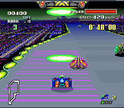 SCHBAM. La grosse claque. Il aurait été vain de faire un jeu aussi avancé techniquement si on avait pas pu le contrôler à loisir (Dragon's Lair je pense à toi…). F-Zero est une leçon de gameplay made in nintendo. Si la vitesse peut dérouter lors de la première prise en main, l'apprentissage se fait très rapidement, et au bout d'une dizaine de courses on fait ce qu'on veut de son vaisseau. Ca tombe bien parce que certains circuits sont particulièrement torturés ! Barrières électriques latérales de rigueur qui endommagent le vaisseau, sauts imposés sans la moindre sortie de piste autorisée (vu que la piste est un peu à des kilomètres du sol…), champs de mines, surface dégueulasse qui ralentit votre carlingue, vent de travers, etc etc etc… Chaque choc bousille un peu plus votre fragile monture, et quand la jolie barre rouge arrive au bout du rouleau, boum, vous vous transformez en pétard du 14 juillet. C'est sympa mais ça irrite.