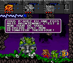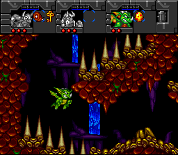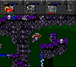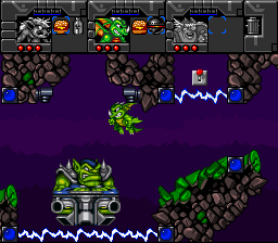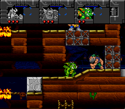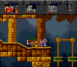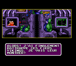 Putain, des cyborgs ! Nos trois héros sont des cyborgs ! Et qui dit cyborgs dit capacités supplémentaires ! Ainsi Erik est doté d'un casque lui permettant de respirer sous l'eau (oui, on peut nager, joie) et d'une paire de godasses à réaction. Baleog a troqué son arc contre un bras bionique lui permettant de se balancer à des attaches prévues à cet effet, et a gagné un sabre laser. Olaf quant à lui possède un casque qui lui permet de se transformer en nain, et lui permettra de passer dans des endroits bas de plafond. On notera aussi que ce dernier a du se farcir un énorme cassoulet la veille, vu que ses gaz lui permettront de se donner un petit coup de boost quand il planera avec son bouclier. Classe, je vous dis. Et ce n'est pas fini ! À notre trio s'ajoutent Fang, (un loup garou combinant Baleog et Erik : saut, attaque au corps à corps et wall-jumps en perspective) et Scorch, (un dragon, combinaison d'Olaf et Baleog : Saut, attaque à distance, plus capacité de planer). Monstrueux, je vous dis !