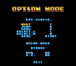 C- aller à l'écran des options, pour reconfigurer la manette, et écouter les musiques et bruitages. À noter que je n'ai pas reconfiguré ma manette en presque 12 ans, mais s'il y a des gens qui veulent mettre le saut et le dash sur Start et Select, libre à eux…