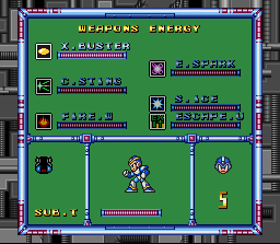 Les gâchettes, elles, servent à alterner entre les armes que l'on a récupéré sur les carcasses fumantes des Mavericks que l'on a envoyés rejoindre la grande animalerie céleste, et le bouton Start donne accès à l'écran d'armes, détaillant le niveau de vie restant, les armes débloquées, leur niveau d'énergie, le nombre de vies (entre 0 et 9), et la présence et le remplissage des Energy-Tanks (ou E-Tanks).