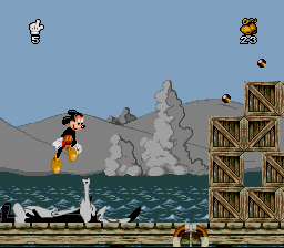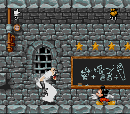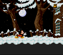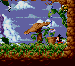 - Pas de problème p'tit con. Alors comme je te le disais, en 1994 on savait faire de bons jeux à licence. Ha on en avait des couilles à cette époque. En réalité, l'idée de départ était de faire un jeu sur Mickey, tu l'auras sûrement compris (sinon je peux plus rien faire pour toi). Deuxième idée, faire un bon jeu. Là tu admettras que ça se corse, mais à la limite c'est possible en forçant un peu. Et dernière idée, faire jeu fidèle à la licence Mickey Mouse. Oui parce que les Magical quest ça va un temps, mais c'est à mille lieux de l'univers Mickey. Bon il suffit de prendre un dessin animé au hasard, et hop on le retranscrit du début à la fin. Là où ça devient compliqué, c'est de faire un jeu sur Mickey qui soit à la fois bon et fidèle à la licence. Et bien crois moi le crois moi le pas, ils ont réussi les bonhommes. »