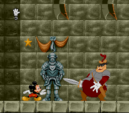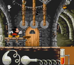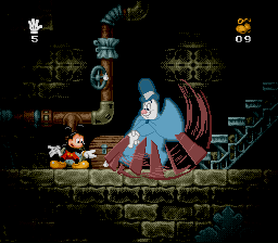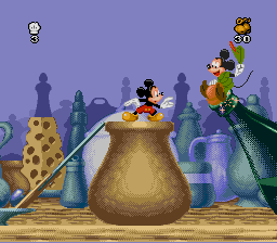 Il a raison. Le jeu ne se contente pas d'être magnifiquement enrobé, il est aussi un exemple de jouabilité. Mickey réagit au doigt et à l'œil. La difficulté est très bien jaugée, de telle manière que les premiers niveaux se passent sans problème et que l'on commence à forcer sur la fin. Pendant que je joue, le Maître commente encore et toujours le jeu.