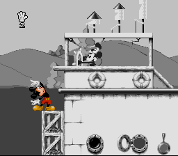 - Je cause, laisse moi finir. Pour pouvoir retranscrire l'univers du petit rat, il n'y avait pas 500 solutions : il fallait adapter directement les dessins animés du rongeur. En effet, quoi de plus représentatif de l'univers Mickey que l'univers Mickey lui-même ? L'équipe des développeurs a donc minutieusement sélectionné six dessins animés de la souris. Mais pas n'importe lesquels, ho que non ! Les plus marquants, ceux qu'une fois vus on n'oublie jamais, ceux qui vous arrachent une larme de nostalgie quand vous les revoyez, ceux que tout le monde connaît, bref, ceux qui ont rapporté le plus d'argent (oui parce qu'il faut pas déconner non plus, le but c'est de parler à un max de gens, mais aussi se faire un max de blé avec les grands classiques. Ca va cinq minutes la nostalgie). Pour justifier, l'enchaînement de ces différents classique, le stagiaire de l'époque a eu une idée lumineuse : « Hé les gars ! Et si on disait que la montre de Mickey est déréglée et que du coup il est obligé de voyager dans le temps pour revivre tous ses anciens films qui ont fait sa gloire ? » Banco. Nous voilà donc parti dans un improbable voyage à travers le temps et l'espace pour (re)découvrir six chef d'œuvres de la maison Disney dans un splendide jeu de plateforme. On redécouvrira donc avec plaisir Steamboat Willie, la troisième apparition de Mickey à l'écran, qui est en fait celle qui marque la naissance de l'animal aux oreilles rondes. Excellente idée que ce niveau d'ailleurs, puisque notre Mickey Technicolor se retrouve propulsé dans un univers en noir et blanc (La couleur était il est vrai assez peu répandue en 1928) qui peu à peu se colorise, comme pour signifier l'évolution de Mickey à travers les âges. Le deuxième dessin animé date de 1933 et s'intitule The Mad Doctor.Mickey cours à la rescousse de Pluto, capturé non pas par Mad the Madman comme le laisserait entendre le titre mais plutôt par un docteur fou qui veut faire fusionner Pluto et un poulet. Un génie comme on en fait plus.