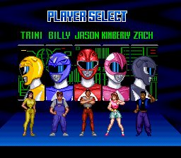 Le scénario, on s'en fout, je ne sait même pas s'il y en a un, je n'ai pas retrouvé le manuel. De toutes façons ça ne doit pas être bien méchant, sûrement sauver le monde, ou au moins un gros état américain. Bref. Une fois passée l'animation de l'écran-titre, on a le choix entre les cinq rangers de la série (les rangers vert et blanc sont absents, mais si je me souviens bien ce sont d'ignobles imposteurs stéphanois, donc on s'en passera). Galerie de portraits :