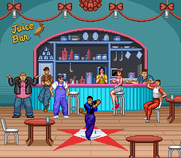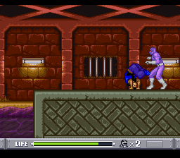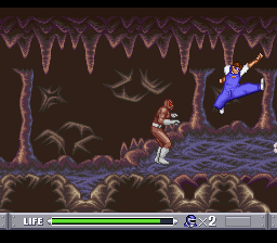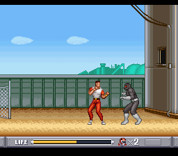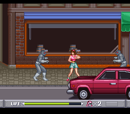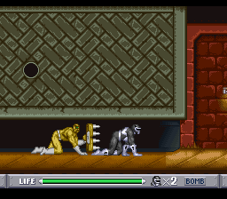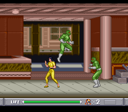 Vous l'aurez compris, tous les persos se valent plus ou moins. Choisissons-en un au hasard et poursuivons. Le jeu se présente sous la forme d'un beat'em all à un seul plan, c'est-à-dire que contrairement à des jeux comme Streets of Rage ou Golden Axe, on ne peut pas se déplacer de haut en bas. Par ailleurs, il ne comporte qu'un seul type d'ennemi, le grunt de base de la série, qui vient en plusieurs déclinaisons de couleurs, selon le nombre de coups qu'il peut encaisser avant de se transformer en une petite motte de terre. Pour tromper l'ennui, certains lancent des couteaux, et ceux que l'on croise à la fin ont des épées.