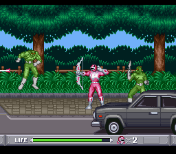 Un petit rappel rapide pour ceux qui ne connaîtraient pas encore leur malheur : Mighty Morphin Power Rangers (en français, « Puissants gardes forestiers du pouvoir transformeur, ou un truc comme ça), c'est une variation des « super sentaî » nippons taillée pour l'exportation, c'est-à-dire avec les passages non costumés remplacées par des scènes avec des acteurs occidentaux. Le pitch tient sur une feuille d'ocb coupée en quatre: cinq adolescents frais et bien formés luttent contre une méchante sorcière planquée sur la Lune. Tous les épisodes suivent le même plan bien établi : les rangers commencent par enfiler leurs collants ridicules pour affronter les méchants de base qui s'effondrent au premier croque en jambe. Vient ensuite le combat contre le monstre du jour, d'abord à taille humaine, puis le bestiau enfle démesurément et les rangers se mettent aux commandes d'un gros robot en plastoc pour lui coller des baffes en stéréo. Tout ça dans le seul objectif de défendre le monde libre et capitaliste, et aussi pour vendre pleins de produits dérivés, dont des jeux vidéo.