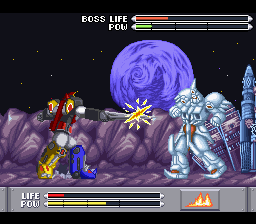 Et voilà, c'est torché. Y'a bien un mini-mode deux joueurs à débloquer à la fin, qui consiste à se refaire les batailles de robots... à deux, et puis c'est fini. Graphiquement, c'est assez pauvre, surtout pour un jeu sorti à la fin de 1994. Merde, au même moment on avait Indiana Jones, c'était quand même pas la même limonade. Pour la musique, celle de l'écran-titre est celle de la série donc, euh, voilà, et les autres sont des variations sur le même thème, ce qui rend l'ensemble assez insipide.