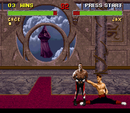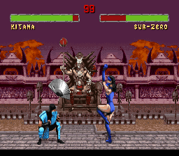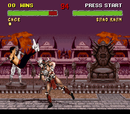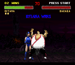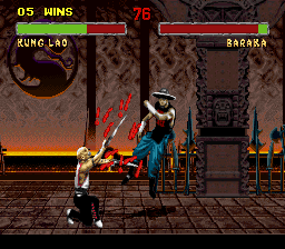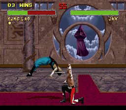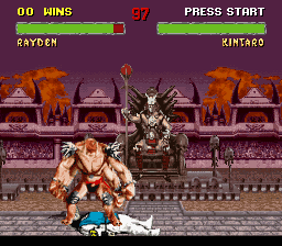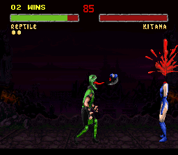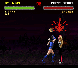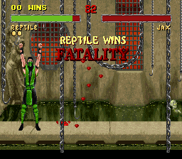 Une suite, c'est l'occasion de renouveler la gamme ou du moins de rafraichir les peintures. Aux rayons des nouveautés, il y a du mouvement au sein de la fine équipe des distributeurs de caramels. Des sept rigolos de l'épisode précédents, on a renouvelé le contrat de 5 et on leur a adjoint sept nouveaux petits camarades de jeu. Procédons à une rapide revue d'effectifs. Nos amis Keno et Sonya s'étant bêtement fait capturer (ils apparaissent néanmoins en position christique dans le fief de Shao Khan, en arrière-plan), ils sont remplacés par Reptile, un clone de Sub-Zero/scorpion avec des écailles ; Baraka un vilain chauve aux dents en inox et couteaux à désosser dans les avant-bras ; les soeurs Mileena et Kitana aux cuisses dénudées et ustensiles tranchants ; Shang-Tsung le chinois métamorphique désormais jouable ; Kung Lao, un moine au borsalino affuté et Jax, le boxeur bio-ionique - oui, j'utilise cette orthographe en hommage à Steve Austin. Que du beau linge ou peu s'en faut. Viennent se greffer à ce petit groupe des personnages cachés (non jouables), plus ou moins issus de délires éthyliques de programmeurs. Le reste est quant à lui plus convenu, un classique affrontement mano à mano jusqu'aux seigneurs de guerre responsables de tout ce merdier, les bien nommés Shao Khan et Kintaro.