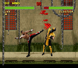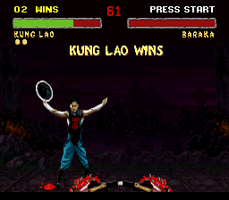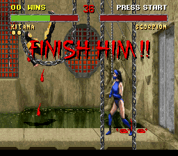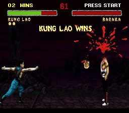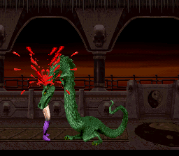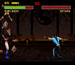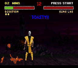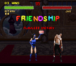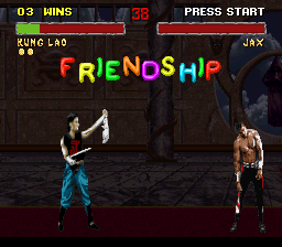 On peut même dire que niveau vivisection, les développeurs n'y vont pas avec le dos de la louche. Faisons un petit calcul : si l'on met de coté les coups qui enlèvent déjà quelques litres de picrate à chaque voyage, on a tout de même deux fatalités livrées de série avec chaque combattant, ce qui nous fait la somme rondelette de 24 façons d'accommoder la viande crue. Ajoutons au menu trois environnements utilisables pour saloper le cadavre de vos adversaires (des pieux au plafond, un chute mortelle d'un pont et un bassin d'acide) et vous aurez à votre disposition moult moyens d'épancher vos déviances carnivores. Mais le plaisir ne s'arrête pas là. Les petits vicieux de chez Scultural Software ont fait carburer la machine à conneries pour nous régaler d'innovations aussi inutiles qu'indispensables. Aux cotés des désormais légendaires falatities, débarquent les babalities et les friendship. Qu'es aco ? Les premières vous permettent de transformer le vaincu en nourrisson (sur lequel on ne peut malheureusement pas enchainer sur une fatality). Idiot mais délicieusement humiliant. Les friendship quant à eux se manifestent par un cadeau offert à l'adversaire ou tout simplement votre personnage qui en profite pour faire le con (tel Liu Kang sortant la boule à facette pour danser le disco). Une rumeur courrait à l'époque sur la présence de sodomities à débloquer mais rien n'a jamais pu être prouvé jusqu'à présent.