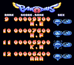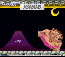 Choix du vaisseau. Tiens, ça semble être assez complet comme panel de tirs. On retrouve Vic Viper de Gradius (oui, Parodius est un peu le petit frère consanguin de Gradius), un poulpe, un truc non identifié nommé Twinbee et un Pingouin. Un PUTAIN de PINGOUIN, bordel ! (merde à la censure fasciste). Mon rêve a toujours été de diriger un pingouin dans un jeu vidéo. Joie ! Extase ! Orgasme !