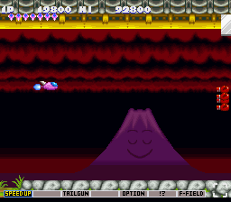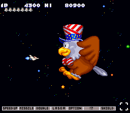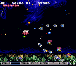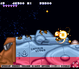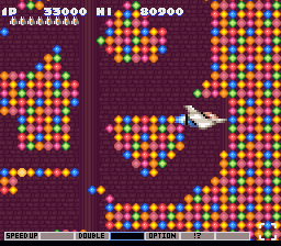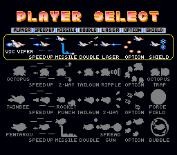 Aïe. Y'a du niveau en face. C'est plein de boulettes. J'ai vite fait de griller un continue (continues qui ont le bon goût d'être illimités. Bref, on va descendre de 4 ou 5 degrés de difficulté. Et on va plutôt prendre Vic Viper. Comme dans tout Gradius, le système d'upgrade du vaisseau est suffisamment clair pour qu'on s'y retrouve facilement. Mais qui dit clair ne veut absolument pas dire absence de stratégie. Les upgrades sont, dans l'ordre : Vitesse, missile, tir de base, tir spécial, option, le magique « ?! » et le bouclier. À noter que les vaisseau choisi n'aura pas les mêmes caractéristiques au niveau des tirs, bombes et options. À réserver à votre style de jeu.