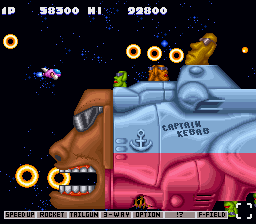 D'ailleurs, mythe, le jeu se permet, outre les multiples références à Gradius, de remettre une couche en reprenant des idées chez la concurrence (oui, la séquence de l'attaque du Captain Kebab est calqué sur un des R-type). Ceci dit, on joue à un fils spirituel de Gradius, et on le sent lors de la séquence finale, qui vous rappellera sûrement quelque chose...