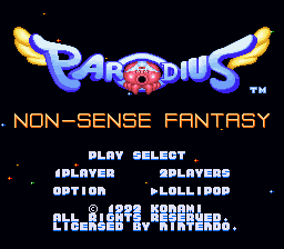 En ce jour, j'étais perdu. Je n'avais plus accès à la sainte connaissance de Lycos, et ce monde que je connaissais si vasteet animé s'était soudain réduit à la taille minuscule de 9m². L'air ne sentait plus la liberté mais la clope froide, et les fringues sales avaient remplacé les vastes plaines. Bref, je n'avais plus internet. Puis, dans un moment d'égarement, j'ai ouvert mon fidèle émulateur SNES, et j'ai parcouru les roms (non, pas ceux avec les caravanes). Parodius.smc. Ah, un shmup. Cool.