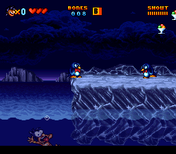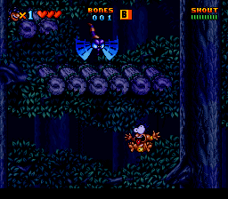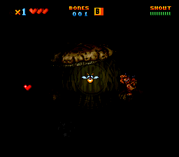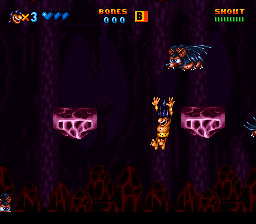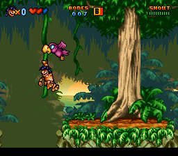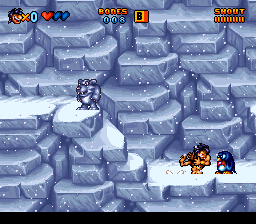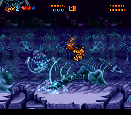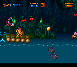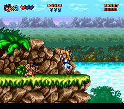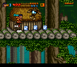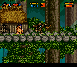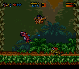 Voilà donc notre bon Sam qui part jusqu'au légendaire cimetière des dinos pour y chercher quelques squelettes qui fourniront une fantastique réserve d'os. Seulement ce cimetière des dinos, ce n'est pas vraiment la porte à côté. Comme de par hasard. La route est donc semée d'embûches. Mais toutes ces épreuves vous ne serez pas le seul à les affronter. En effet, toutes les personnalités du village vous accompagnent pour ce long voyage. Chose amusante en soi puisque vous avez été désigné comme seul homme capable d'arriver en un seul morceau au cimetière des dinos et que le chef et doyen du village vous précède dans chaque niveau, comme ça, à la fraîche, sans jamais se faire dévorer sauvagement par la moindre bête féroce. Et heureusement qu'il est là le brave homme car c'est lui qui vous dictera votre objectif au début de chaque niveau. Car chaque niveau a un objectif, eh oui. Outre la collecte du maximum de nourriture, il vous faudra à chaque fois remplir un objectif vous permettant de terminer le niveau. Bien sûr, on ne joue pas à [Insérez ici le titre d'un jeu avec des missions excessivement compliquées. L'auteur, malgré son infinie culture, n'en connaît point], votre objectif se résumera souvent à trouver tel ou tel objet pour l'amener à un endroit précis. Cela semble rébarbatif et répétitif sur le papier mais la qualité du level design est telle que l'on n'a jamais l'impression de faire la même chose. Ces différents objectifs amènent donc un peu de variété bienvenue au soft.