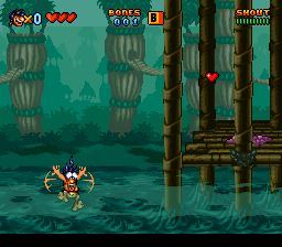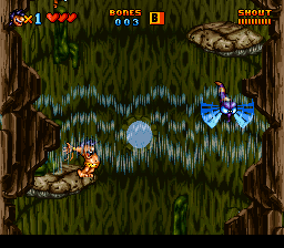 C'est donc une joyeuse troupe de six personnes qui va explorer notre planète préhistorique. Notre belle planète ai-je envie de dire. Notre magnifique planète même. Car oui, Préhistorik Man est très beau. C'est du grand art, une maîtrise du pixel art comme on en voyait peu à l'époque et comme on en voit encore et toujours aussi peu. Chaque personnage et chaque décor pue le souci du travail bien fait. De plus, le tout est servi par une animation agréable qui fait littéralement vivre un monde préhistorique devant vos petits yeux humides d'émerveillement. La palme revient, vous vous en doutez, au personnage principal de notre aventure : Sam. Le jeune guerrier possède en effet une palette immense de mimiques totalement hilarantes. C'est simple, on dirige un vrai petit personnage de cartoon. Je voudrais d'ailleurs attirer votre attention sur la posture de Sam lorsque vous pressez la touche bas de la croix directionnelle. J'adore.
