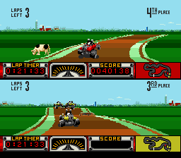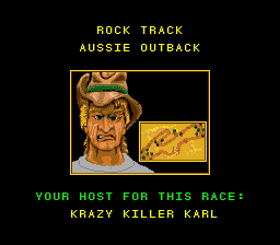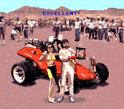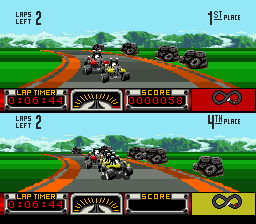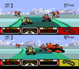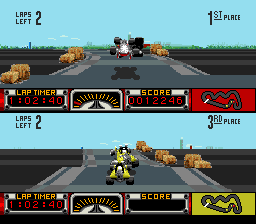 Pouf pouf. Road Riot 4WD. En voilà un jeu qui a une histoire. En fait non. C'est désespérant. L'histoire derrière ce jeu n'est en fait qu'un triste vagabondage dans la pampa girondine une dimanche matin incroyablement quelconque. Une fois de plus je fus abusé par l'annonce d'une brocante qui ne se révèlera être qu'une triste rangée de tréteaux offrant des reliques d'une époque s'étant éteinte à la mort de Pompidou. Je soupire. D'un autre coté sachons relativiser, cela pourrait être pire, je pourrais être dans le Médoc. Après un stand tenu par un homme du peuple dont le visage trahissait une appétence pour le mauvais vin et proposant des jeux Game Boy ayant visiblement effectué un séjour dans un champs de betteraves, je découvre in extremis une modeste pile de jeux Super Nintendo sur la misérable planche de bois clôturant ce triste débarras : Robocop 3, Dragon Ball Z et Road Riot 4WD. Au diable l'exigence, je prends. Soupir.