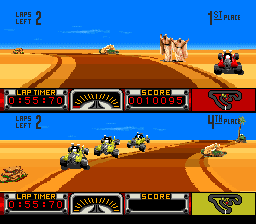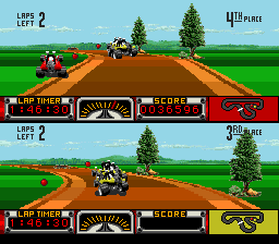 Accrochez-vous aux poignées, il risque d'y avoir du vent. Car d'entrée de jeu, l'écran est scindé en deux. Comme ça, sans préavis, à jeun. Ai-je précisé que nous sommes en mode un seul joueur ? Voilà, c'est fait. Je tressaute dans un discret hoquet hystérique. Ahem, si vous me passez l'expression. Dans un éclair de démence qui aura été confondu avec de l'inspiration lumineuse, le démiurge aux commandes de ce machin aura jugé pertinent de réserver la moitié de l'écran à un véhicule contrôlé par l'ordinateur. 50% pour un putain de CPU. Un cognac vite, mes nerfs me lâchent. Dès lors, réussir à focaliser son attention sur la conduite se son véhicule lors d'une course relève de la gageure oculaire de haut niveau.