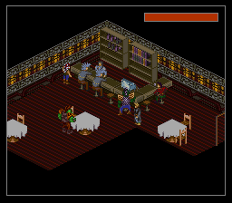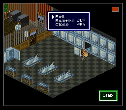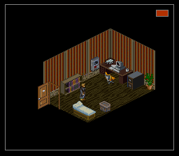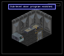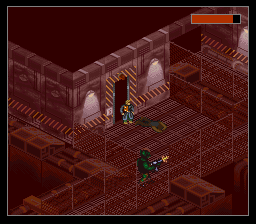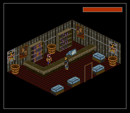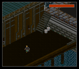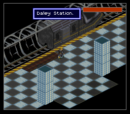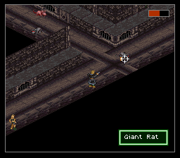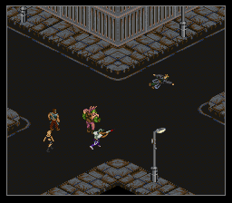 Je suis passé un peu vite sur le gameplay, j'y reviens. Basiquement, avec votre croix vous vous déplacez sur la grille. Un bouton pour accéder au menu, des boutons pour examiner les objets, passer en mode curseur (un pointeur apparaît, dirigé sans trop de lourdeur par la croix, joie), voire en mode viseur : oui vous visez "à la souris" sans pouvoir vous déplacer. C'est un coup de main à prendre, mais de fait, au milieu d'un échange de tirs, ça ne vous servira pas à grand-chose de chercher à éviter les balles, le but est plutôt de trouer l'adversaire le plus vite possible. Donc on se concentre sur ça cible et on encaisse en attendant. Et finalement c'est aussi bien, car rappelez-vous, nous somme en isométrique et essayer de viser juste est voué à l'échec si on n'a pas un joli pointeur de souris. Encore une fois, repensez à ces boss dans Equinox, que vous ne touchiez que parce qu'ils avaient la courtoisie de faire un demi-écran de large. Et comme la Super Nintendo n'a qu'une seule croix, autant qu'elle serve à viser, et pour les déplacements on repassera. Oui, désolé, pour avoir deux croix, il faudra attendre le Virtual Boy, moi aussi quelque part ça m'épate.