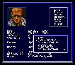Par contre pour sa petite copine on repassera, elle le largue comme une grosse salope dès le début, et merde à la censure. De toute façon elle sentait des pieds. Plus intéressant sera, finalement, la relation avec ce chien bizarre qui vous suit et qui vous parle. Et s'il ne faisait que parler, déjà, ça serait suffisant pour aller consulter un psychanalyste de garde pas trop cher, mais en plus il parle d'esprits, de destin, de mission. Ah. Oui. Parce que ce que je ne vous ai pas dit, c'est que la particularité de Shadowrun, c'est d'assaisonner le cyberpunk d'un poil de magie.