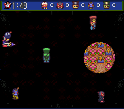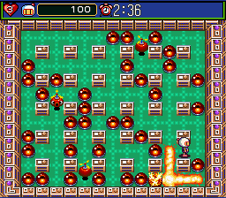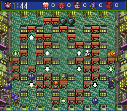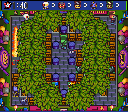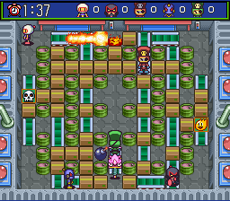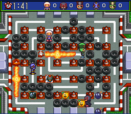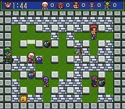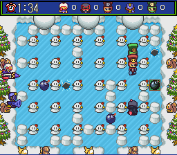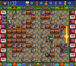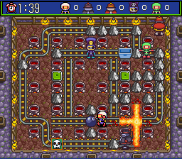 Grand fan de la deuxième version sur snes, je fus (dés)agréablement surpris de la qualité de jeu des CPU, tout récente pour moi, pauvre novice face à ces Attilas de la bombe. Intelligents, c'est le mot... En revanche une fois mort on peut revenir sur le plateau après avoir bombé ses adversaires du haut des murs (ce qui est une innovation qui permet à tous les niveaux de s'affronter, ça change...)