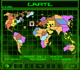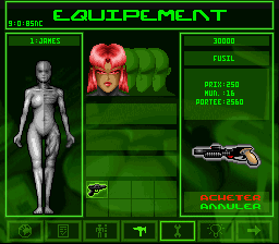 Pour ce faire, l'action se divise en deux parties. Premièrement, sur la carte, on décide d'une zone à attaquer parmi celles proposées à chaque tour. Ensuite, on sélectionne quatre agents cyborgs dans notre réserve cryogénique personnelle, on leur achète des armes (qui vont du piou-piou au turbo-laser qui fait fondre la cible en un tir), des bricoles (médikit, bombe à retardement), des implants cybernétiques (cerveau, œil, torse, cœur, bras, jambe) qui améliorent la résistance aux balles, la guérison automatique des blessures, et j'en oublie. On passe aussi par la case R&D où l'on peut attribuer des fonds plus ou moins importants aux différentes branches de recherches (armes légères, lourdes, implants, tout ça), histoire d'avoir du matos encore plus puissant au tour suivant. Puis on lit le briefing de la mission, basiquement « un policier/journaliste/procureur menace de faire du tort à notre belle entreprise familiale de rillettes en conserves, tuez-le, violez sa femme, vendez ses enfants à un bordel de Bangkok et persuadez sa mère de travailler pour nous ».