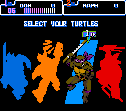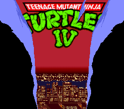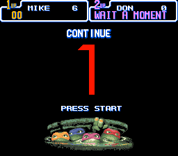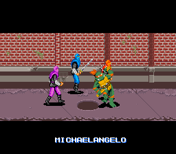 Écran titre : vous ne rêvez pas, ce jeu est complet. Effectivement, on se retrouve devant un menu qui nous propose de jouer un beat'em all à un ou à deux joueur, un mode versus pour se mesurer à son pote, et un mode time trial dont le but est de finir le niveau le plus vite possible. Les options complètent l'écran de présentation et vous allez voir que ce mode est assez sympa. On y règle d'abord le niveau du jeu, puis les contrôles (on remarque qu'il n'y a au maximum que trois boutons utilisables). On peut aussi régler le nombre de vies, le Dash (la faculté de courir) manuel ou automatique, l'activation du back attack (coup en arrière si on est encerclé), le fameux sound-test !!! (qui a son importance, vous comprendrez pourquoi…), le mode mono ou stéréo, et enfin la cerise sur le gâteau : le color mode. Alors qu'est-ce que c'est ? Grâce à lui, on peut choisir le type de coloration pour nos tortues : ceux qui on appris à les connaître via l'anime verront les tortues de la même couleur verte, mais ceux qui sont fan des comics (1er support de leurs aventures) pourront enfin les voir avec leurs couleurs originelles qui vont du kaki au vert clair, ce qui individualise mieux les personnages.