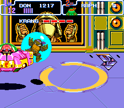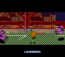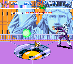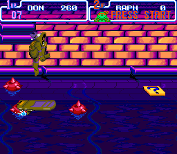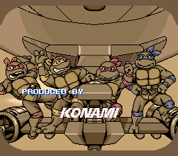 À part ça, j'ajoute que les graphismes des personnages sont minutieux, et l'animation n'a pas pris une ride. D'ailleurs, on se croirait carrément dans un épisode de l'anime, surtout qu'au début du jeu, on a le droit au générique avec Leonardo qui découpe l'écran en deux pour le plus grand plaisir des fans. J'en arrive alors aux sons. Les musiques sont très fidèles au dessin animé, c'est-à-dire très rythmées. Et on le doit à Kôzô Nakamura, le compositeur de TMNT 2 : The Arcade Game, ainsi qu'aux deux producteurs de chez Konami, Kazuhiko Uehara et Harumi Ueko. Du coup, ce sont de superbes musiques qu'on s'prend dans les tympans (ah… celle de « Neon Night-Riders », qui ne l'aime pas ? Je la classe sans hésiter dans les 10 meilleures musiques des consoles 16 bits, au côté de celles de Bare Knuckle), d'où l'importance du sound-test. Les bruitages sont aussi parmi les plus sympa de la SNES, notamment les fameux « Pizza Power », « Cowabunga », le sourire de Shredder, la voix digitalisée très fun quand on prend une part de pizza, ou les phrases à l'introduction d'un stage.