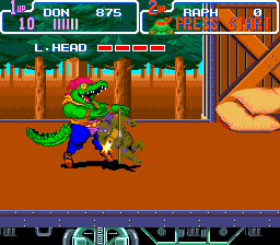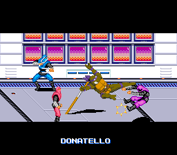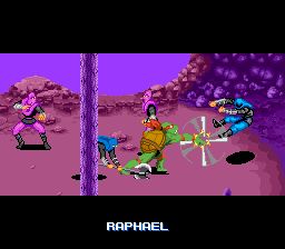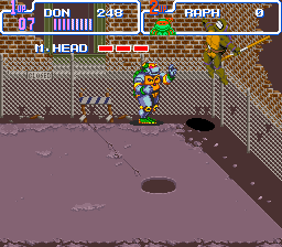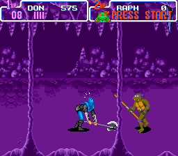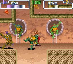 Le mode versus est simple : chaque joueur choisi une tortue parmi les quatre et l'affrontement se fait dans les égouts. C'est Splinter qui joue le rôle d'arbitre et les deux autres tortues assistent au combat. C'est fun car les coups sont variés et en plus, on peut avancer en perspective (à la manière d'un Double Dragon). Le seul reproche serait le manque de personnages et de stages mais bon, quelqu'un qui joue à se jeu ne vient pas pour défier son pote sans cesse. Non, il vient pour le plat principal : le mode beat'em all, et ce dernier est très fun.