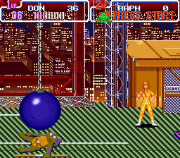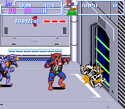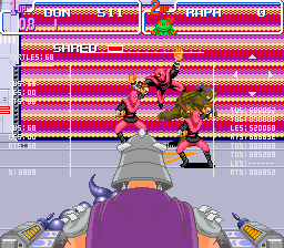 Stop. Vous pensiez vraiment que j'allais continuer à parler de cet opus sans évoquer les projections ? Elles sont tout bonnement magnifiques ! Soit on fait un ippon avec les Stone Warriors qui se cognent entre eux et explosent, soit on choppe un type et on l'utilise pour frapper d'autres adversaires qui nous encerclent (ah oui… Du coup, on lui fait rencontrer le sol plusieurs fois de suite), soit (et à force de mettre des cerises sur le gâteau, ça devient un gâteau aux cerises) on peut projeter un de ses ennemis sur l'écran avec un effet de zoom sensationnel ! Spéciale mention pour la première rencontre avec Shredder, où l'on doit jeter sur l'écran le maximum de gardes possibles pour défoncer son tank.
