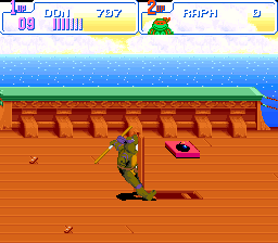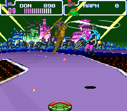 Les stages sont très détaillés. On sent que le jeu est une adaptation d'arcade vu comment les éléments du décor peuvent interagir avec nous ou les ennemis. Les niveaux sont très colorés (pas trop rassurez-vous) et on file du pont Big Apple de New York au Technodrome, en passant par les égouts et les ghettos de la ville. Et… ça n'est que la première partie du jeu ! Parce que dans la seconde moitié, on voyage à travers le temps, et autant le dire, les mondes sont beaux (et là je m'adresse à toi lecteur qui a déjà joué à ce jeu. Je sais très bien que tu penses à « Neon Night-Riders »). Neon Night-Riders, c'est le bonus stage qu'on rencontre dans la dernière partie du jeu. On est sur un skate-board volant, parcourant la nuit, une autoroute perchée au dessus de la ville. Le but étant de s'accaparer le max de points possibles en dégommant le plus de mecs et en collectant le plus de bonus, avec à la clé un boss. Ce monde utilise le mode 7 de la plus belle manière qui soit, et à chaque fois que j'y joue, c'est CE monde que j'attends, la nostalgie à l'œil.